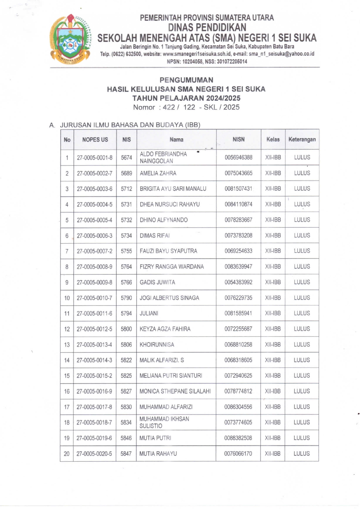 PENGUMUMAN HASIL KELULUSAN SISWA TP. 2024/2025
