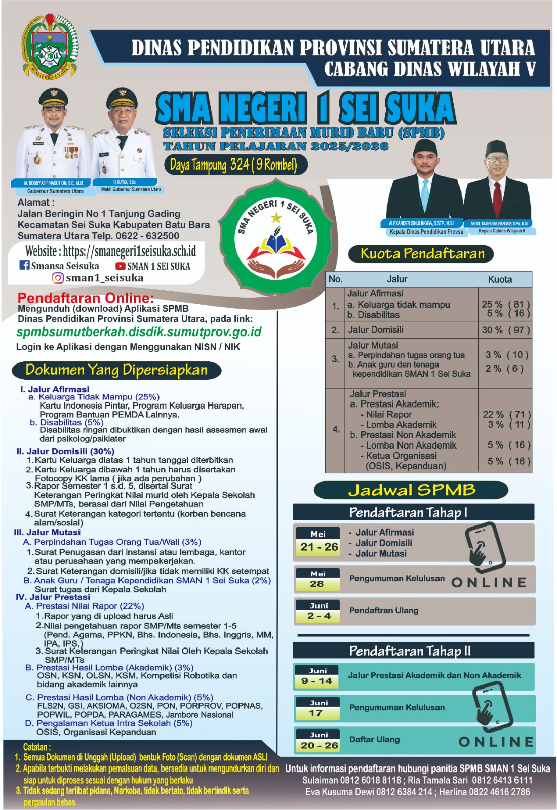 Dalam hal SPMB tahun pelajaran 2025-2026 ini, SMA Negeri 1 Sei Suka yang berada dibawah naungan Dinas Pendidikan Provinsi Sumatera Utara menggunakan sistem pendaftaran ONLINE dengan handphone. Dimana pendaftaran serentak untuk sekolah SMA/SMK Negeri untuk cabang wilayah 5. Daya tampung sebanyak 324 peserta didik, yang dibagi menjadi beberapa jalur pendaftaran yaitu : Jalur Afirmasi, Jalur Domisili, Jalur Mutasi dan Jalur Prestasi. Pendaftaran dilakukan 2 tahap, yaitu tahap I tanggal 21 - 26 Mei 2025 dan tahap II tanggal 9 - 14 Juni 2025. Aplikasi dapat di unduh dialamat web https://spmbsumutberkah.disdik.sumutprov.go.id. Untuk informasi lebih lanjut dapat menghubungi panitia SPMB SMA Negeri 1 Sei Suka.